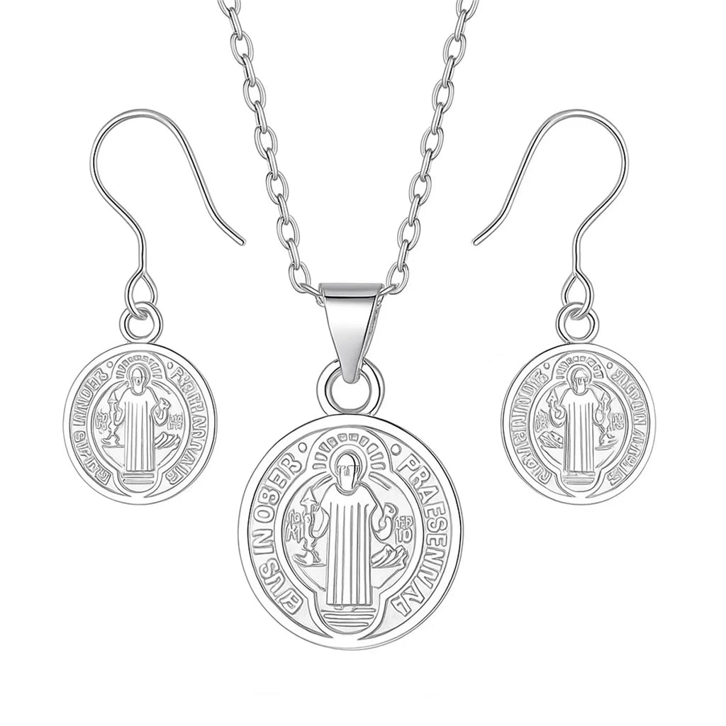 Set de collar y aretes de medalla San Benito para mujer, elaborado en acero inoxidable color plateado. Las medallas tienen un diseño delicado y detallado, ideal para quienes gustan de accesorios con significado espiritual y estilo moderno. Es un conjunto ligero y cómodo, perfecto para usar a diario o para regalar en ocasiones especiales.